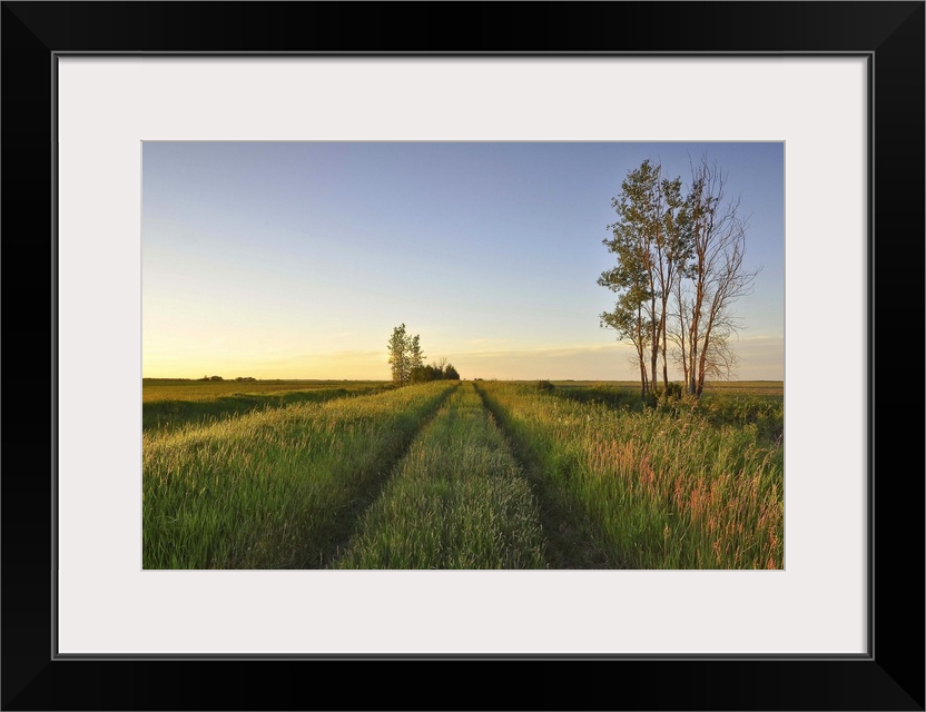 <p>Tire tracks on path used by farmers to move machinery from one field to another. Prairie. Sunset.</p>