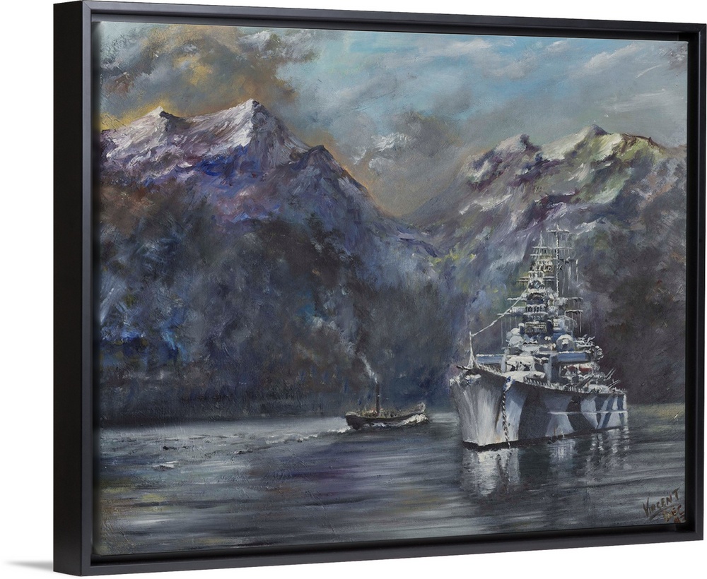 <p>Contemporary painting of a battle ship in a harbor surrounded by mountains.</p>