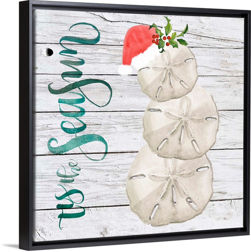 <p>Beach-themed Christmas decor with sand dollars and text, "Tis the Seasun."</p>