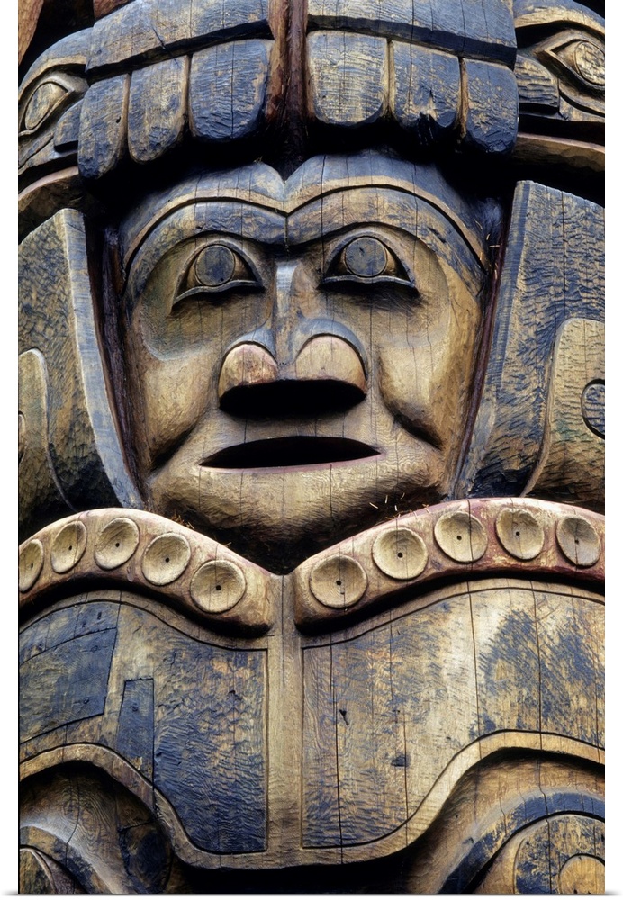 <p>Closeup of Tlingit totem pole, Sitka national historic park, Sitka, Alaska, southeast, summer.</p>