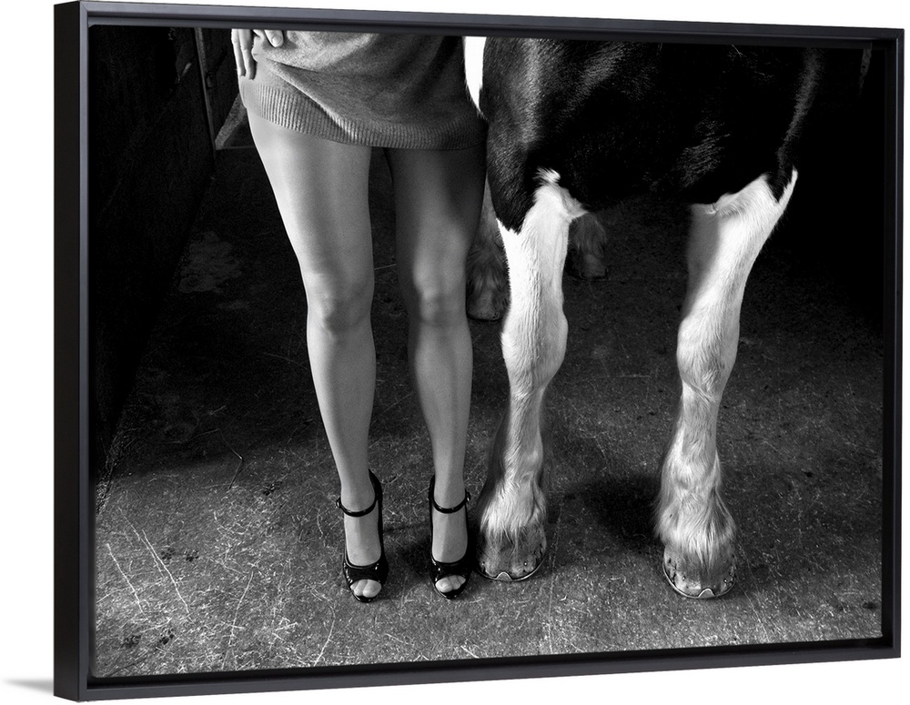 <p>The legs of a woman in high heels standing next to the forelegs of a dairy cow.</p>