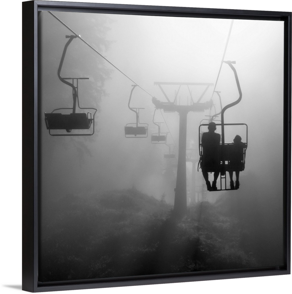 <p>Two silhouetted people on a chairlift heading into the dense fog.</p>