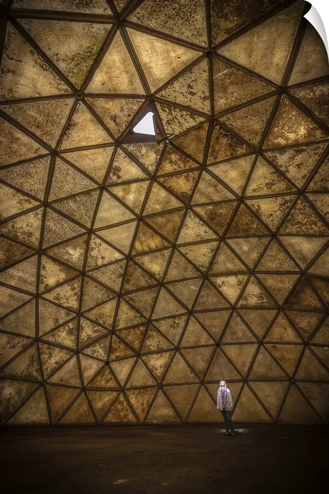 <p>A person standing in a spotlight created by one open panel in a geodesic dome structure.</p>