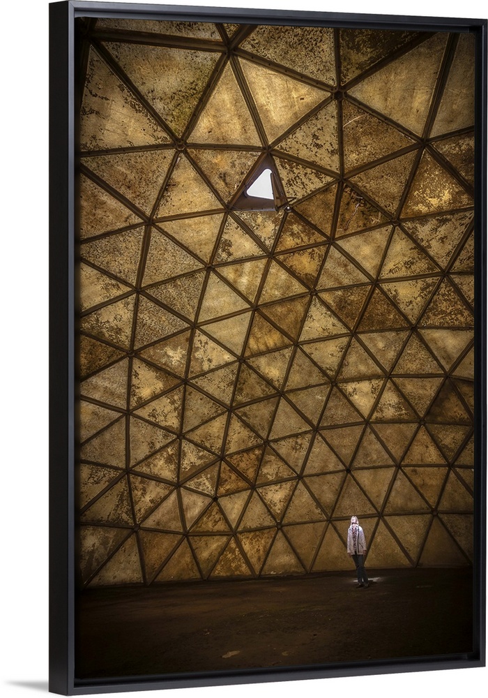 <p>A person standing in a spotlight created by one open panel in a geodesic dome structure.</p>