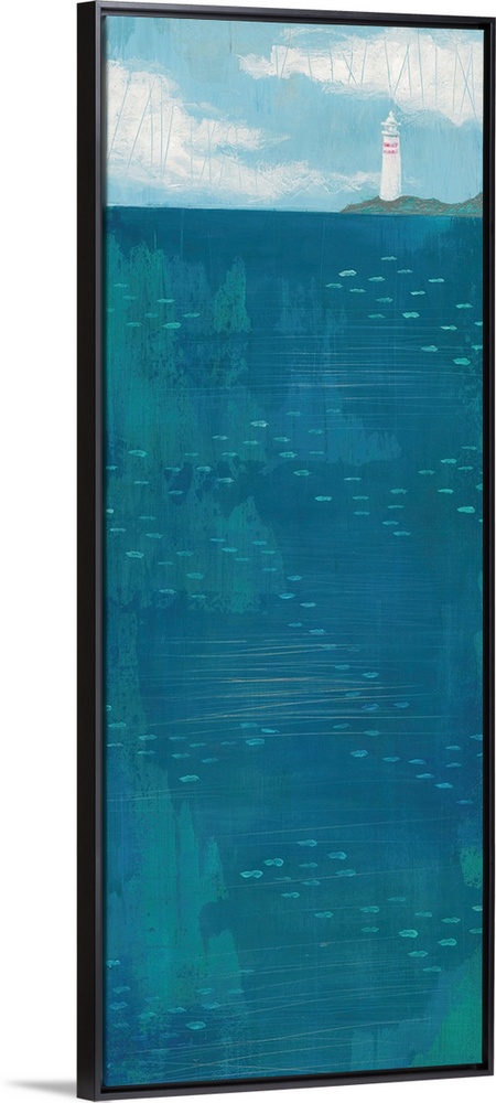 <p>Contemporary artwork of a lighthouse seen in the distance across a dark blue sea.</p>