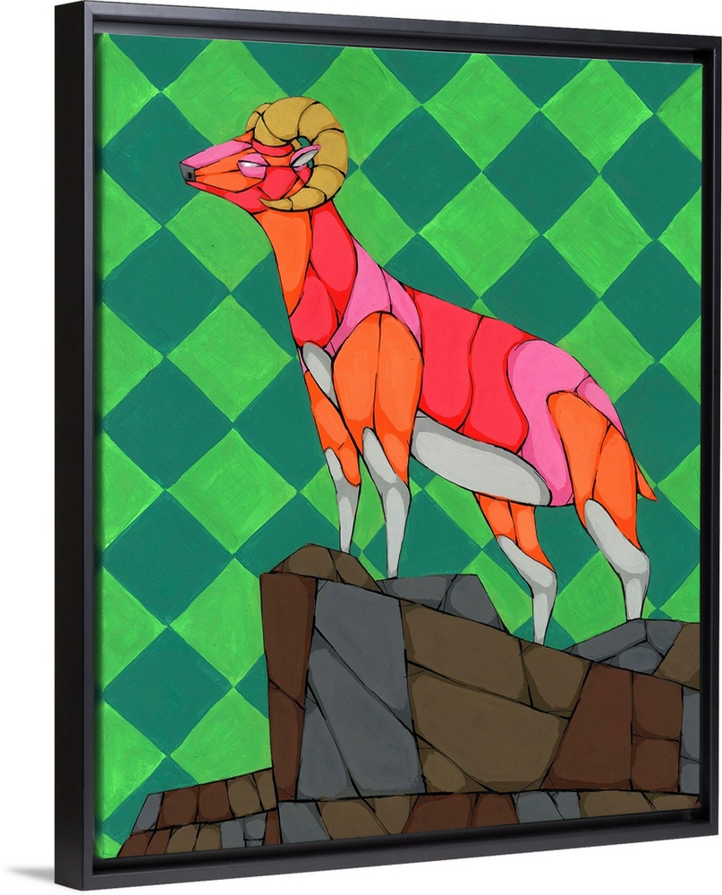 <p>Colorful painting of a ram on top of a cliff with a green diamond patterned background.</p>