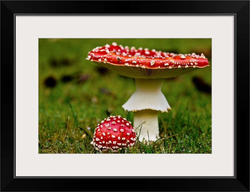 <p>Photograph taken of two red mushrooms with one larger and its top turned up while the other is much smaller.</p>