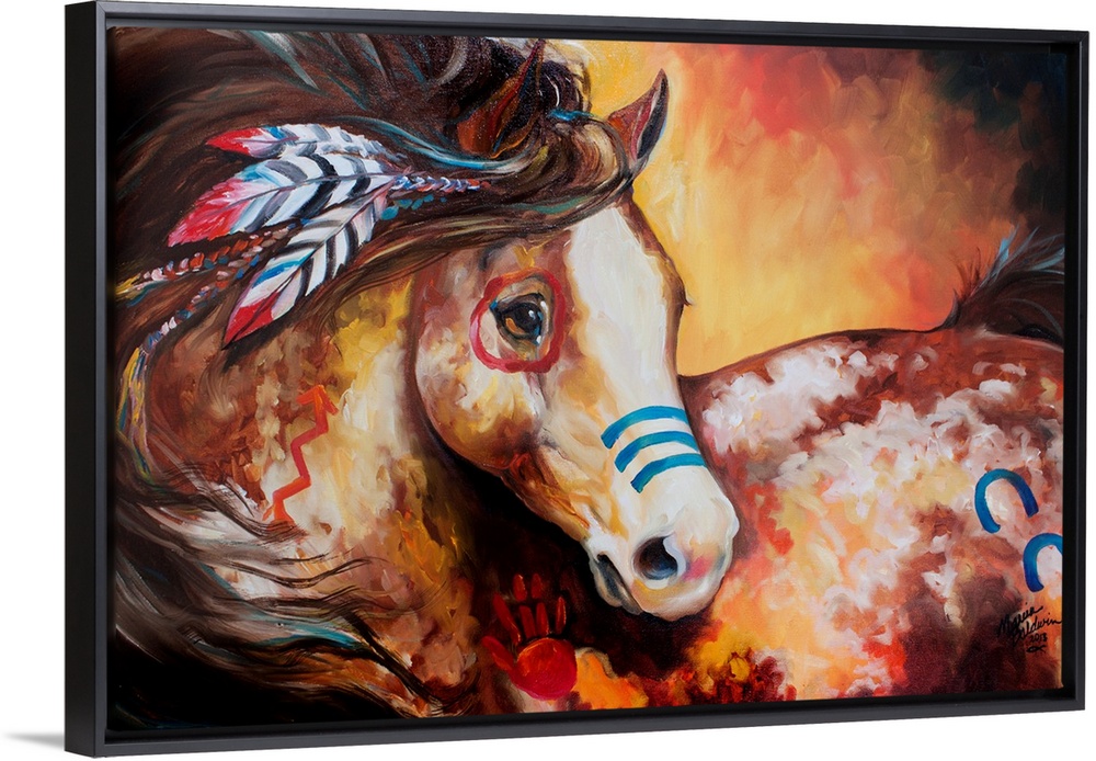 <p>Contemporary painting of an Indian War Horse in warm tones with red and blue body paint and feathers in its mane.</p>
