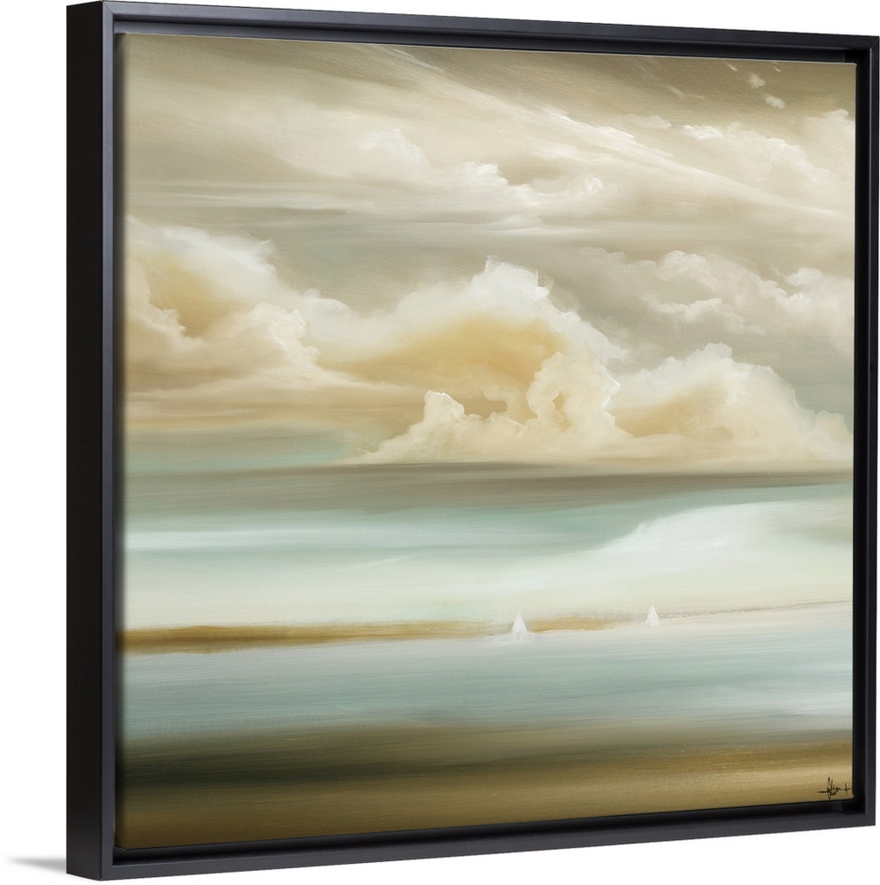 <p>A square painting of a seascape with a cloud filled sky and small white sailboats in the distance, in soft neutral tones.</p>
