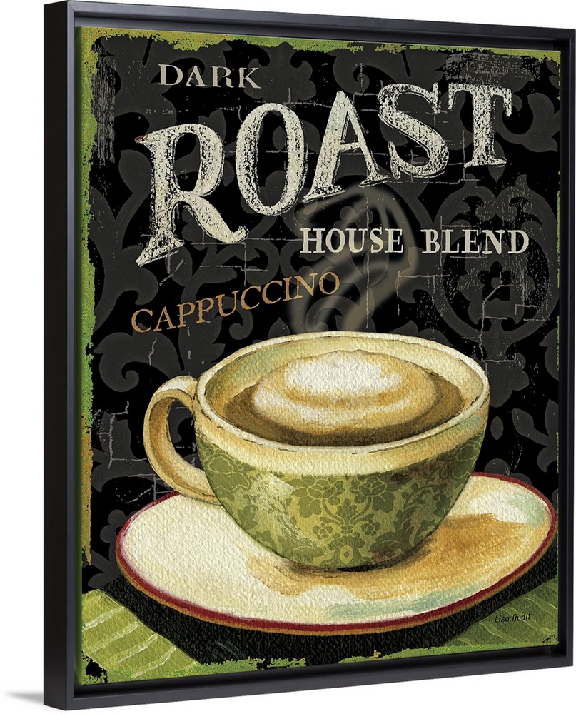 <p>Big painting on canvas of a cappuccino with text at the top.</p>