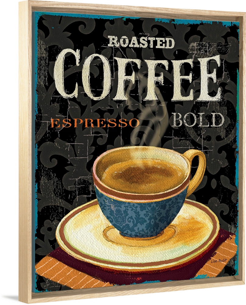 <p>Large vertical artwork a steaming cup of coffee on a saucer, on a crackling background with scrolling shapes. The words "roasted, coffee, espresso and bold" in various size print above the cup.</p>