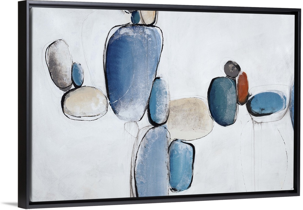 <p>Abstract painting using light blue to create shapes that look like rocks all balancing in air.</p>