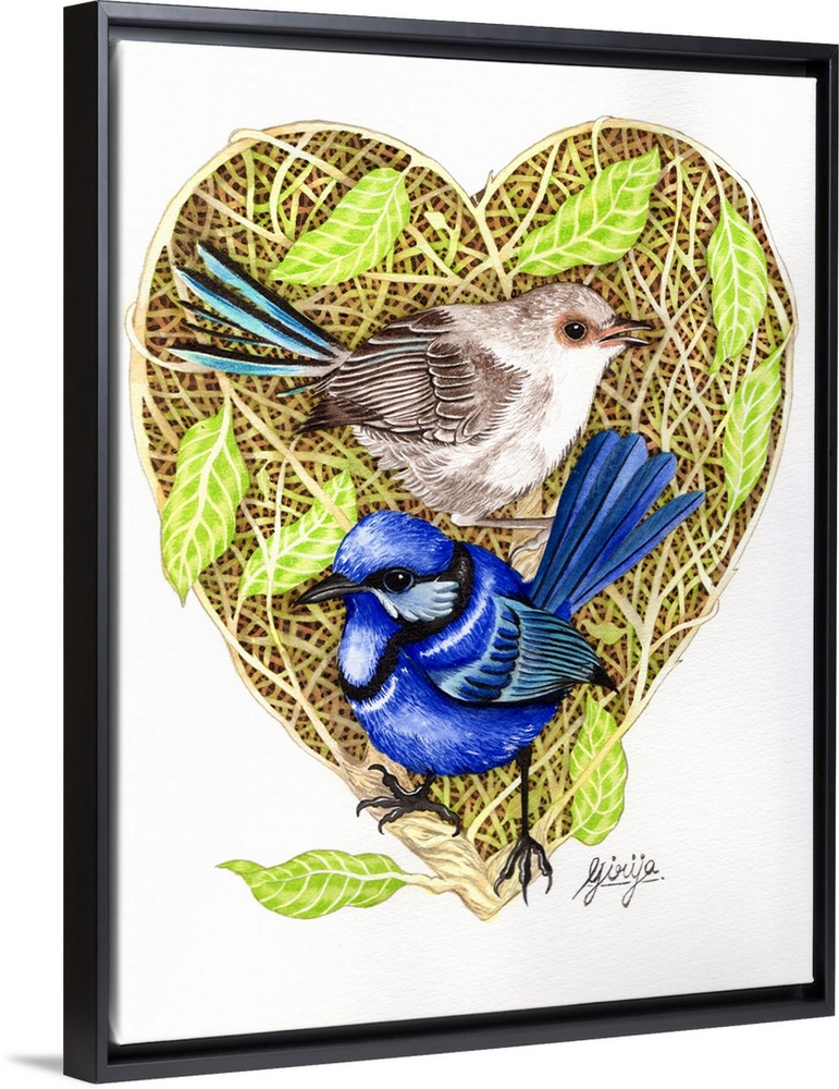 <p>The superb fairywren pair is painted against the heart shape woods in watercolor on paper.</p>