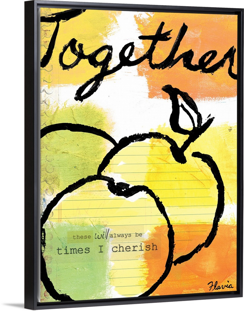 <p>There are several patches of color applied to this print with an outline drawn of fruit and an inspirational quote written inside it.</p>