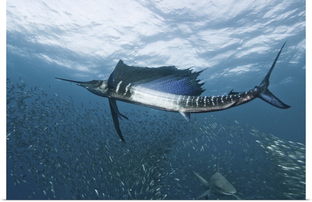 <p>A sailfish swims through a school of smaller fish, with a shark passing by below.</p>
