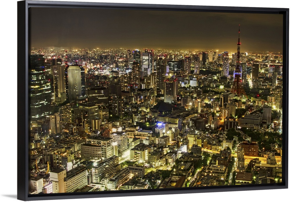 <p>Horizontal, big aerial photograph of the city of Tokyo, brightly lit at night.</p>