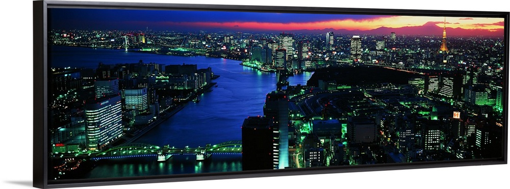 <p>Panoramic photo on canvas of a lit up downtown cityscape with water flowing through it.</p>