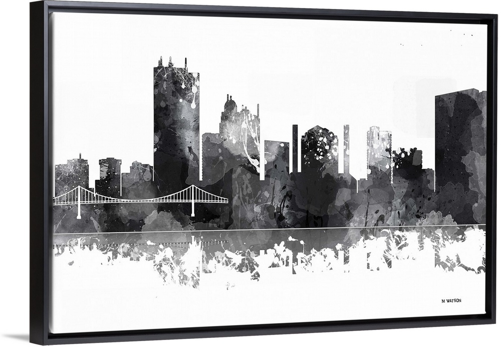<p>Contemporary black and white watercolor skyline casting a mirror-like reflection below.</p>