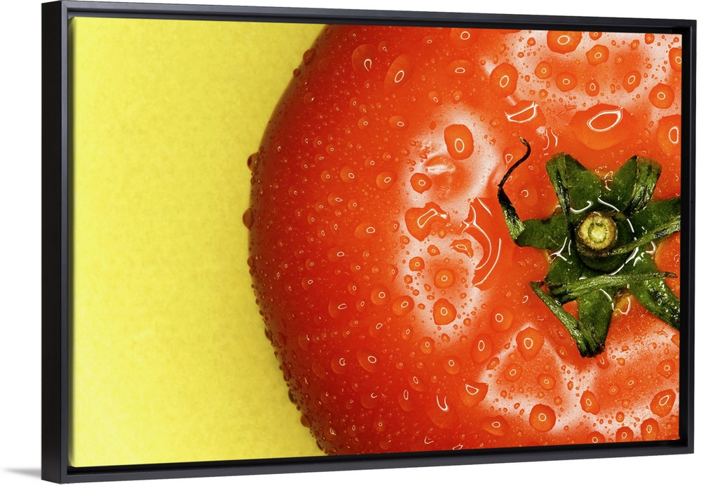 <p>Large, landscape, close up photograph of the top of a tomato covered in small drops of water, on a golden background.</p>