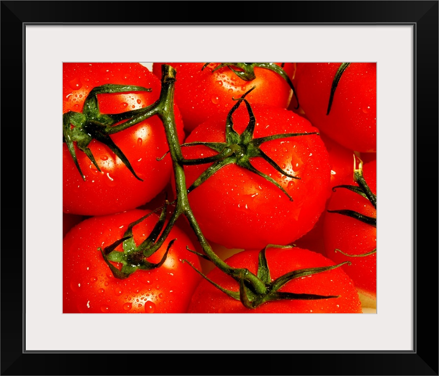 <p>Up close view of a bunch of tomatoes on the vine printed on canvas.</p>