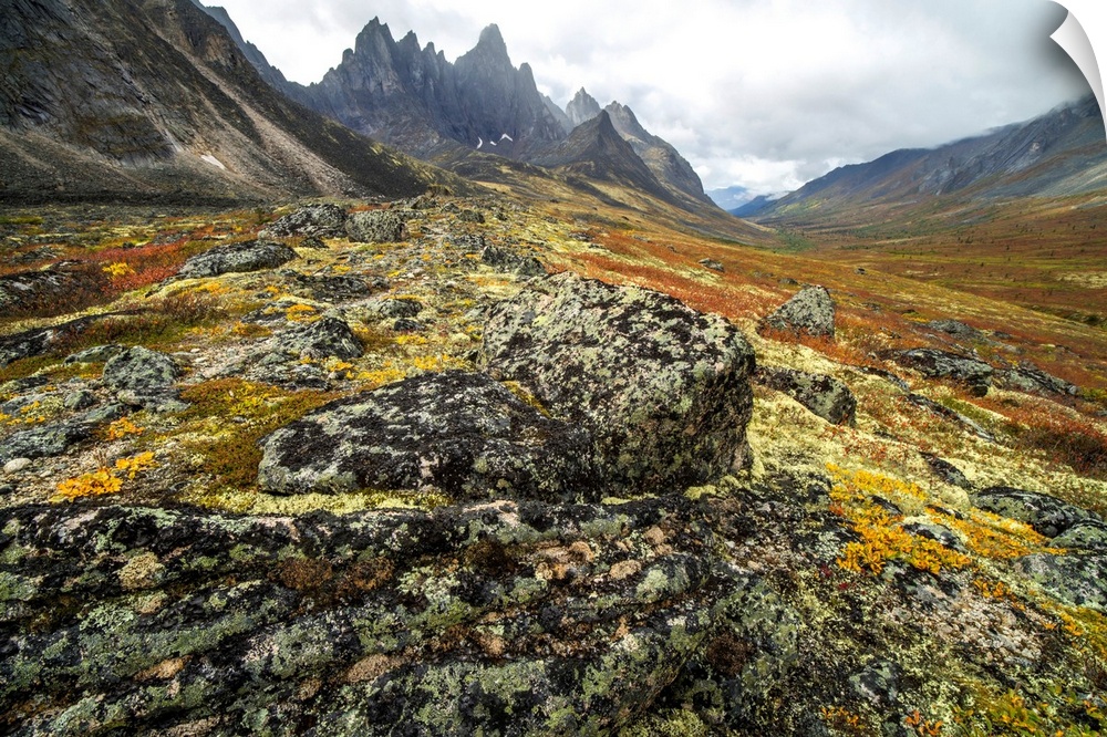 <p>The Tombstone Valley in autumn colours with Tombstone Mountain rising above the tundra in Tombstone Territorial Park, Yukon, Canada.</p>