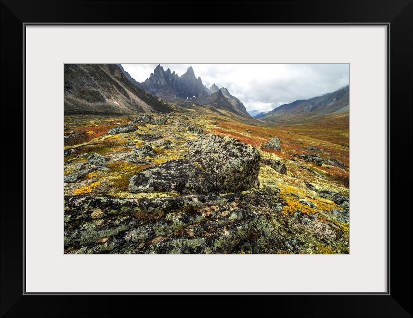 <p>The Tombstone Valley in autumn colours with Tombstone Mountain rising above the tundra in Tombstone Territorial Park, Yukon, Canada.</p>