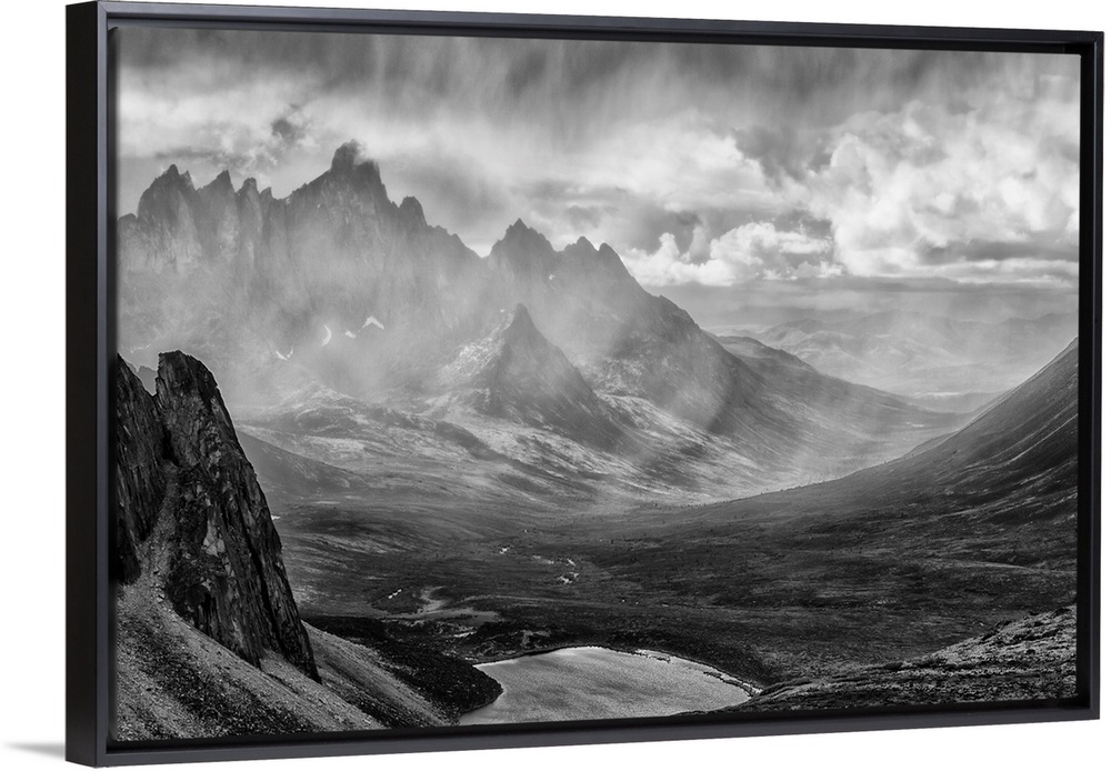 <p>Black and White image of a rain storm over the Tombstone Valley in Tombstone Territorial Park, with Tombstone Mountain shrouded in the rain in the distance. Yukon, Canada.</p>