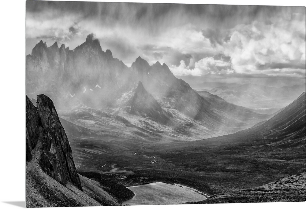 <p>Black and White image of a rain storm over the Tombstone Valley in Tombstone Territorial Park, with Tombstone Mountain shrouded in the rain in the distance. Yukon, Canada.</p>