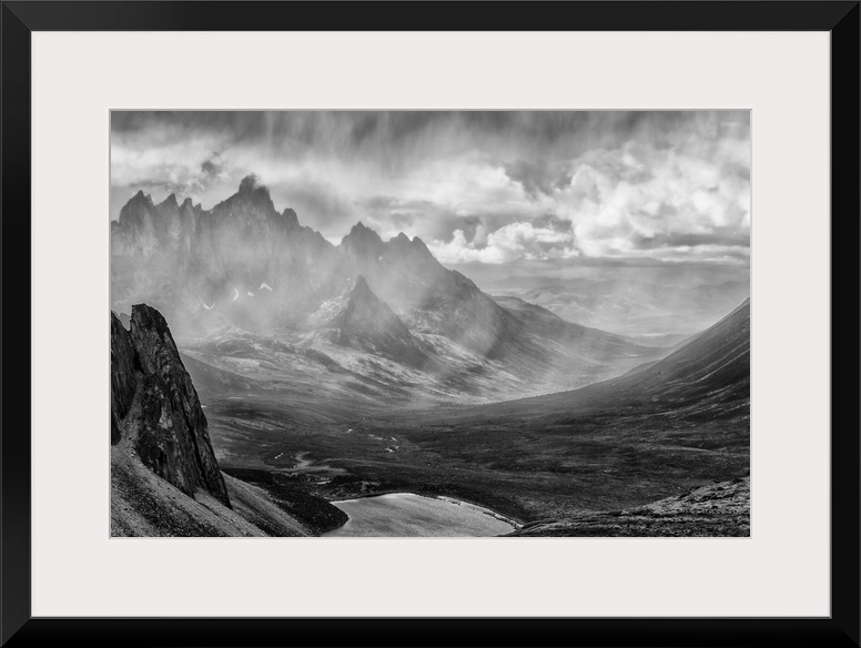 <p>Black and White image of a rain storm over the Tombstone Valley in Tombstone Territorial Park, with Tombstone Mountain shrouded in the rain in the distance. Yukon, Canada.</p>