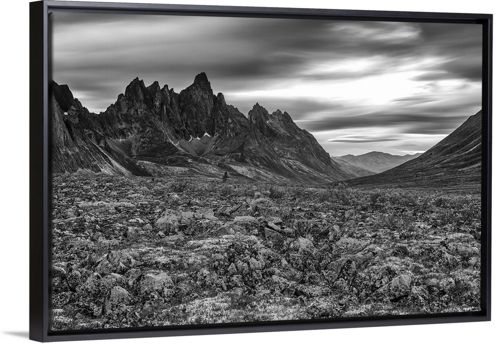 <p>Black and white image of the Tombstone Valley in Tombstone Territorial Park, Tombstone Mountain in the distance. Yukon, Canada.</p>