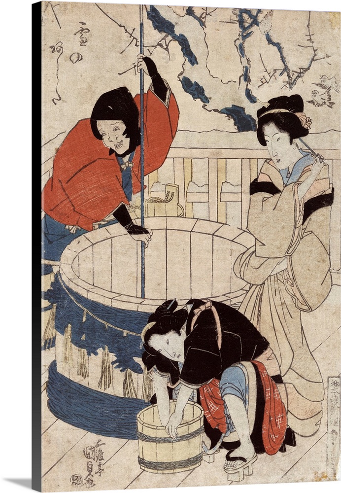 <p>Tomorrow's snow by Toyokuni Utagawa. Woodcut, colour print of an upper class woman standing near a well and two women, possibly servants, getting water at the well.</p>