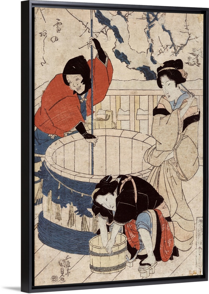 <p>Tomorrow's snow by Toyokuni Utagawa. Woodcut, colour print of an upper class woman standing near a well and two women, possibly servants, getting water at the well.</p>