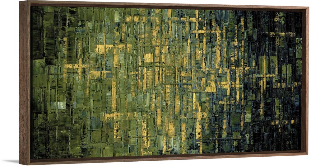 <p>Large abstract painting with shades of green, gold, charcoal gray, and black.</p>