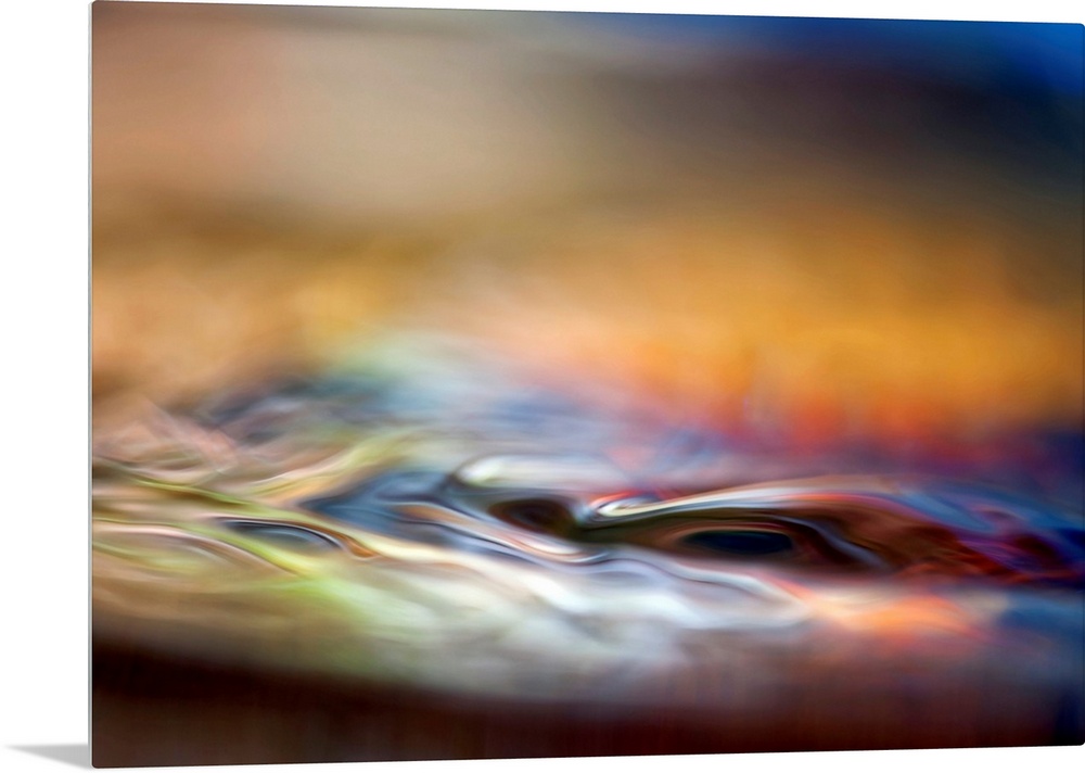<p>Abstract photograph of smooth liquid undulations reflecting various evening hues with a shallow depth-of-field.</p>