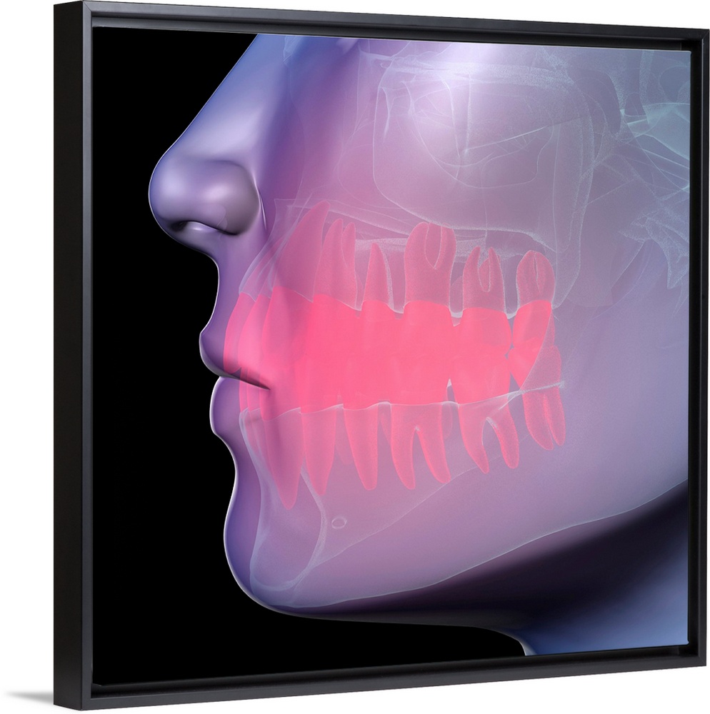 <p>Toothache. Conceptual computer artwork showing pain (represented as the red area) in the teeth. The bones (white) of the mouth and face are shown within an outline (purple) of this part of the body.</p>