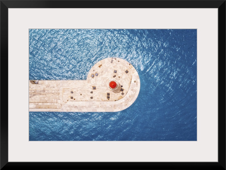 <p>Top Aerical View Of Red Lighthouse Against Blue Water Of Sea</p>