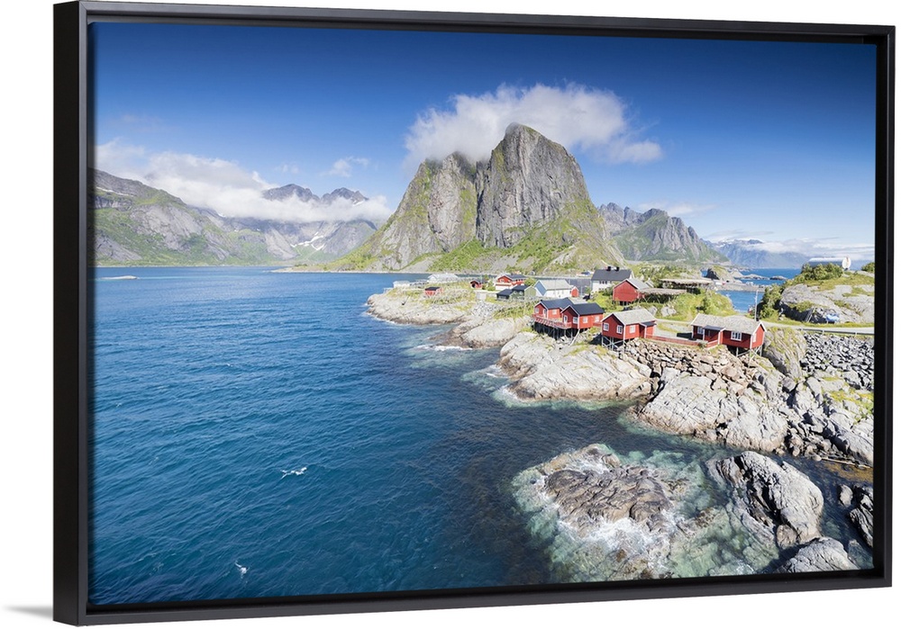 <p>Top view of the fishing village framed by blue sea and high peaks Hamnoy, Moskenesoya, Nordland county, Lofoten Islands, Norway, Scandinavia, Europe</p>