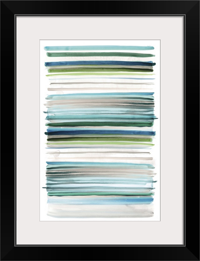 <p>Abstract watercolor artwork of horizontal bands of varying widths in shades of turquoise, grey, and tan.</p>
