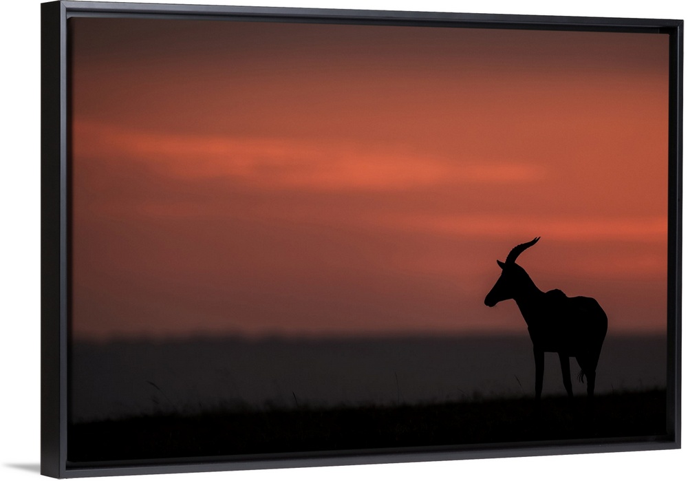 <p>A topi (Damaliscus lunatus jimela) stands in profile on the horizon at sunset. It's body is silhouetted against the bright pink clouds in the sky, Maasai Mara National Reserve; Kenya</p>