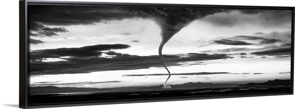 <p>Panoramic photograph of funnel cloud reaching down to earth surrounded by a dark, cloudy, stormy sky.</p>
