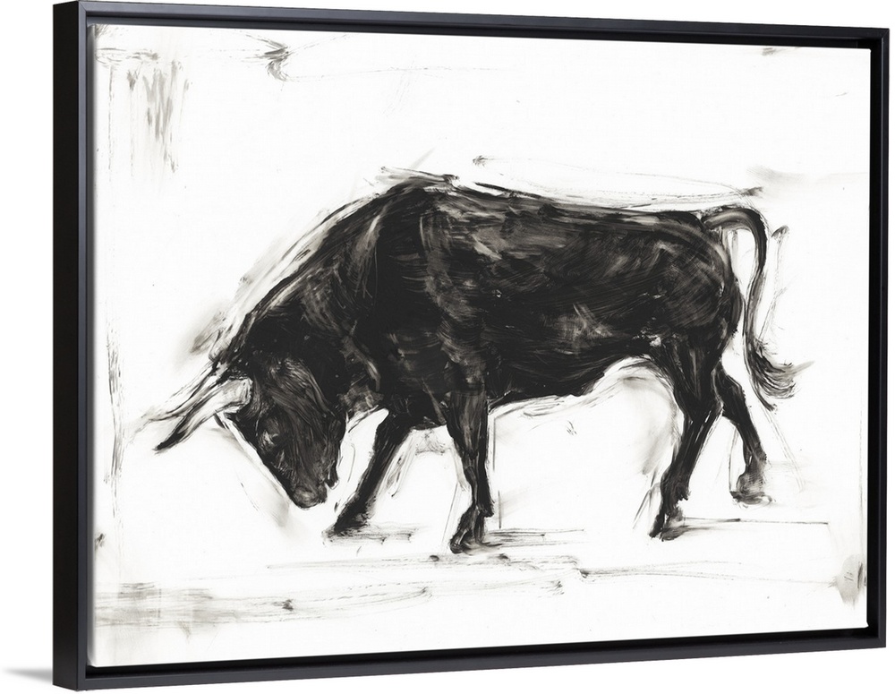 <p>Black and white painting of a Spanish bull bowing.</p>