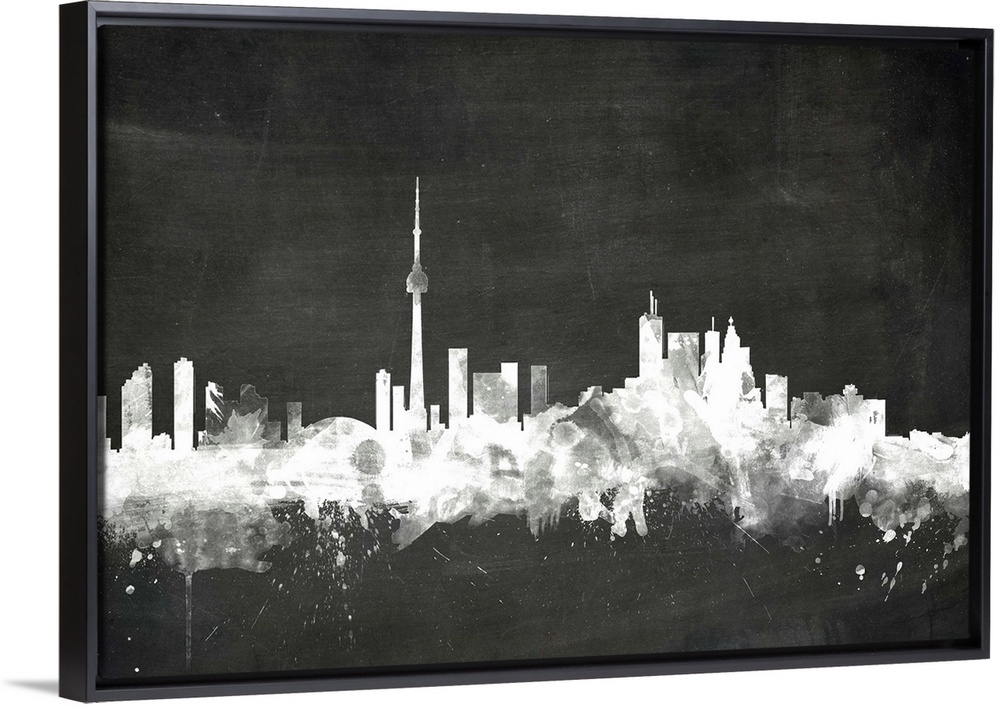 <p>Smokey dark watercolor silhouette of the Toronto city skyline against chalkboard background.</p>