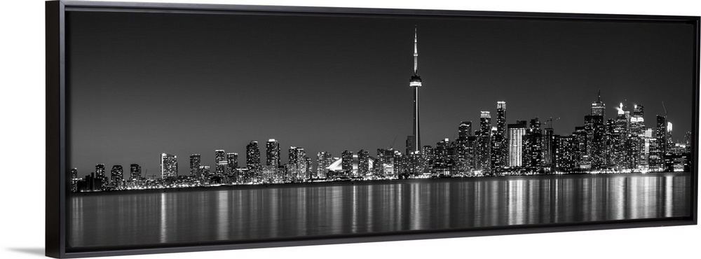 <p>Panoramic photo of the Toronto city skyline with lights reflected in the water at night.</p>
