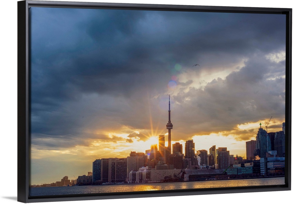 <p>Toronto city skyline under a dramatic sunset with clouds overhead, Ontario, Canada.</p>