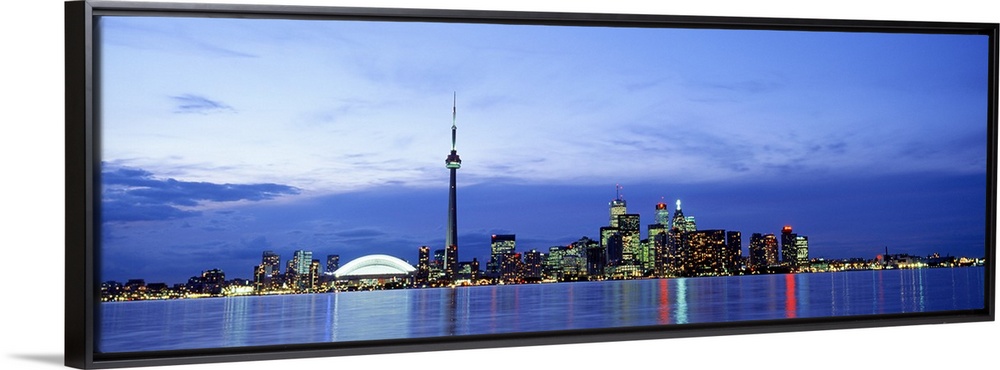 <p>A wide angle photograph taken of an illuminated skyline in Canada at dusk. The lights reflect in the water shown in front of the buildings.</p>
