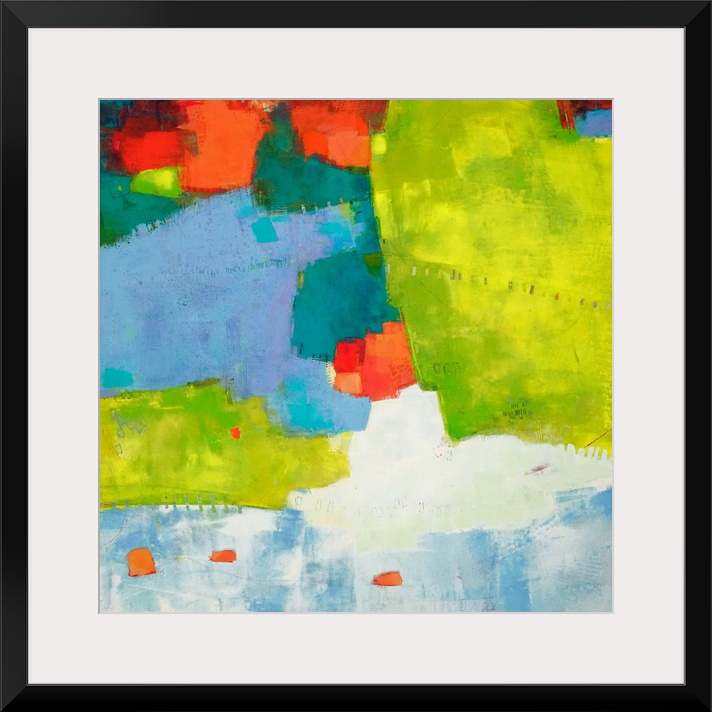 <p>Abstract contemporary art in tropical lime green, blue, and bright orange.</p>