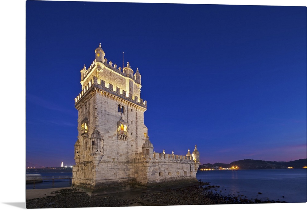 <p>The early 16th century Portuguese Manueline Style, Torre de Belem designed by the architect Francisco de Arruda at twilight with the River Tagus Estuary in the background, in Pedroucos, Belem, Cruz Quebrada, Lisbon, Portugal.</p>
