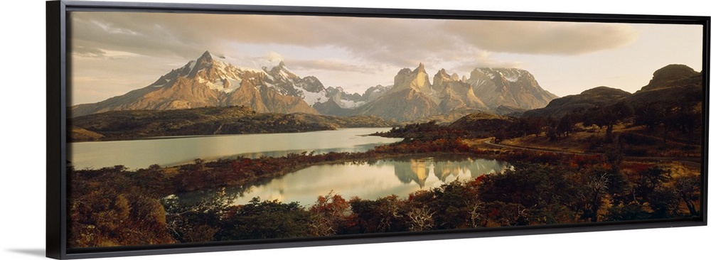 <p>Big, landscape, wide angle photograph of snow covered mountains behind waters surrounded by forest, in Torres del Paine National Park, Chile.</p>