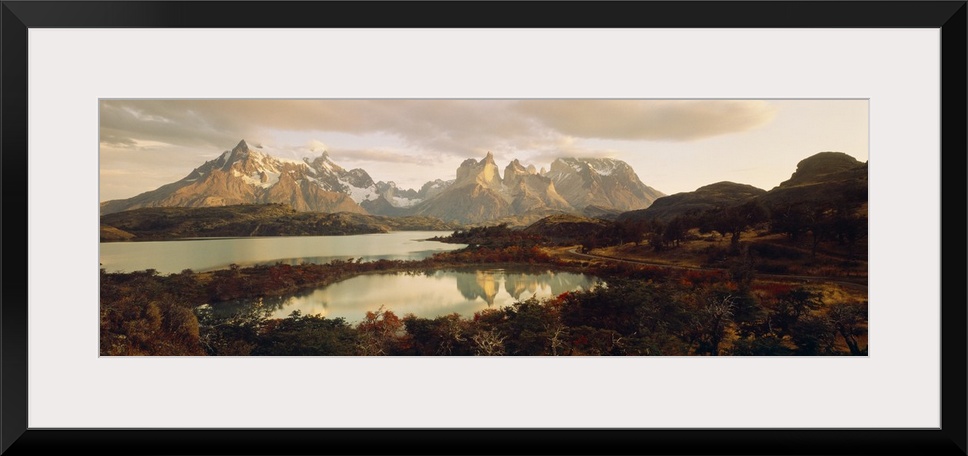 <p>Big, landscape, wide angle photograph of snow covered mountains behind waters surrounded by forest, in Torres del Paine National Park, Chile.</p>
