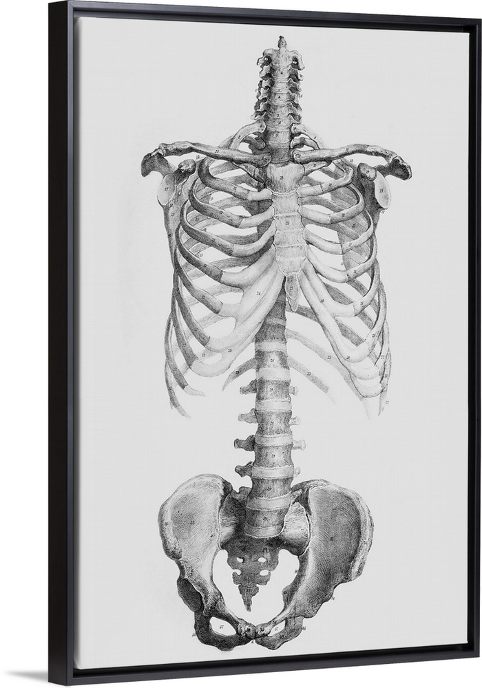 <p>Torso bones. Historical anatomical artwork of the bones of the human torso, seen from the front. The backbone (vertical, centre) is a flexible column of 26 spinal bones (vertebrae) supporting the body and protecting the spinal cord. The backbone joins to the skull (not seen) and to the pelvis (lower centre). The bones of the pelvis also connect to the leg bones (not seen). Twelve pairs of ribs (connected to the backbone and breastbone) form a protective cage (upper centre) around the heart and lungs. The scapula bones (shoulder blades) and clavicles (collar bones) are also shown. Artwork from The Bones and Ligaments of the Human Body (Ed. Jones Quain, 1842).</p>